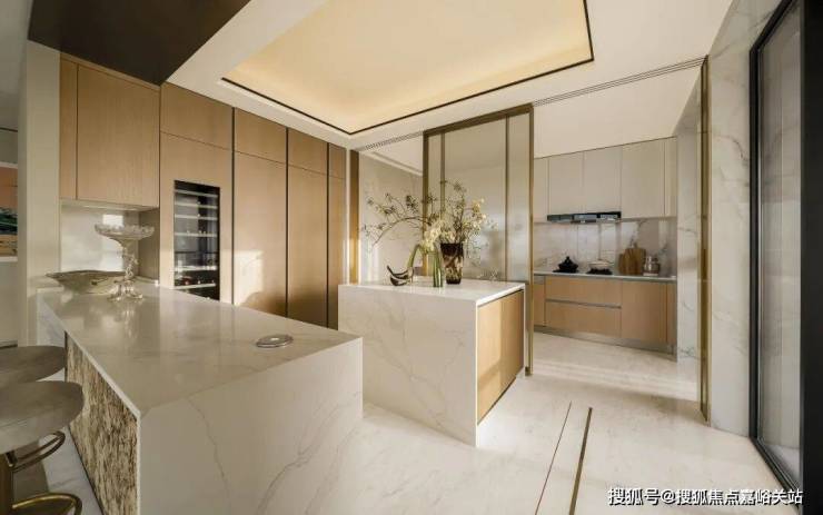电视墙及玄关背景墙采用 意大利奢石芬迪白 ,独特的玉质感与流动纹理如山水画,而且保利贴心的提供了多款石材可供选择,将高定推向极致!