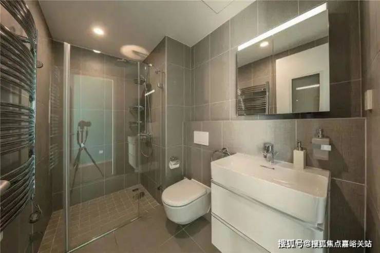 浴室的设计亮点在超薄的蓝钻陶瓷,这种陶瓷采用的都是紧边半径设计。压槽模式被精致坚固的外壁所取代,反而打造出极简的建筑线条。