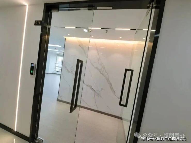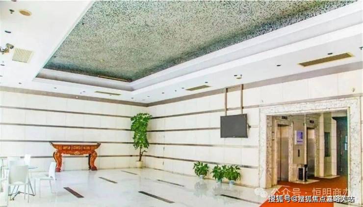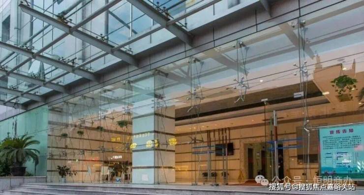 大堂:15米挑高气派大堂,采用天然干挂石材与中空双层LOW-E幕墙玻璃。