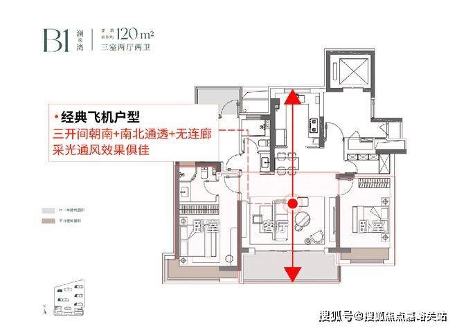 建面约120㎡3房2厅2卫,做到了3开间朝南+双阳台+主卧套房设计+270°转角飘窗,居住体验、舒适度、尺度感倍增。