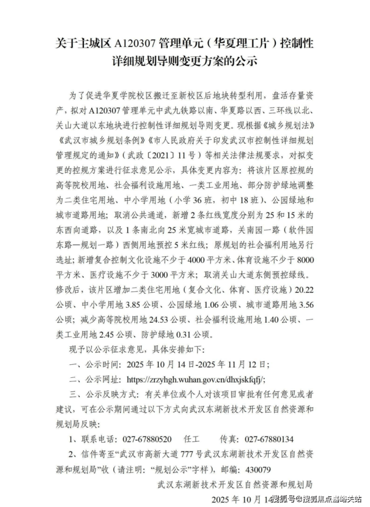 近日,市规划和自然资源局发布《关于主城区A120307管理单元(华夏理工片)控制性详细规划导则变更方案的公示》