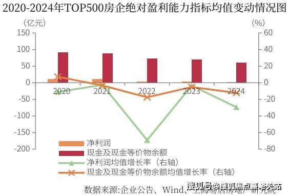 2024年TOP500房地产开发企业营业收入均值95.08亿元,同比下降11.57%,降幅较上年有所扩大。营业成本均值80.93亿元,同比下降6.72%。净利润均值2.25亿元,同比下降29.46%,现金及现金等价物余额均值60.71亿元,同比下降12.21%,行业整体销售持续回落,同时外部融资难问题依然存在,房企持有现金规模持续萎缩。