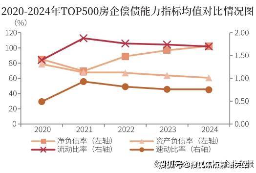 从长期偿债能力看,TOP500房企2024年资产负债率均值为60.72%,较上年下降3.12个百分点;净负债率均值为102.50%,较上年上升5.58个百分点,净负债率连续三年上涨。短期偿债能力方面,2024年TOP500房企流动比率均值为1.70,较上年下降0.04;速动比率均值为0.75,较上年下降0.01,二者较上年均有小幅下滑。有八成的房企速动比率小于1,可变现的流动资产无法覆盖流动债务,短期偿债压力较大。