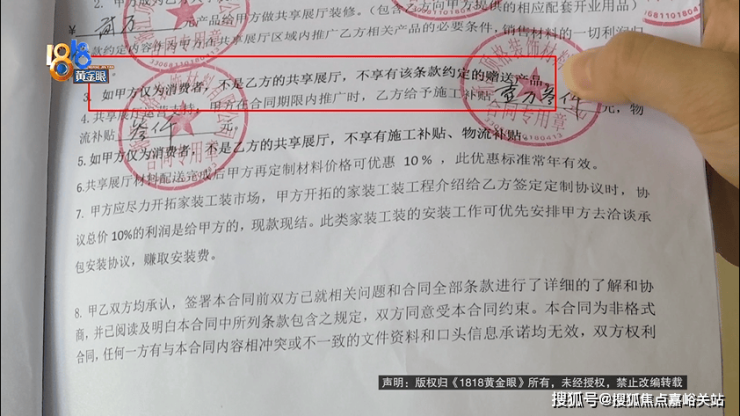 工作人员表示负责人不在,暂时没法给刘女士进一步处理,刘女士报了警,也给那位熊经理打了电话,熊经理强调他们公司和刘女士是合作关系,合同里约定“如果甲方仅为消费者,不是乙方的共享展厅,不享有该条款约定的赠送产品”也“不享有施工补贴、物流补贴”。