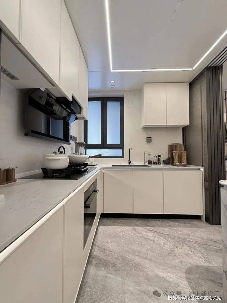 走进海上·清和玺的厨房,墙面 岩板通铺,视觉效果超棒。开门采用完美系列 水波纹玻璃加上 金属造型边框的玻璃移门,时尚又大气。顶部配置 线性凉霸、LED 嵌入式回形灯带和筒灯,烹饪时光也变得无比美妙。