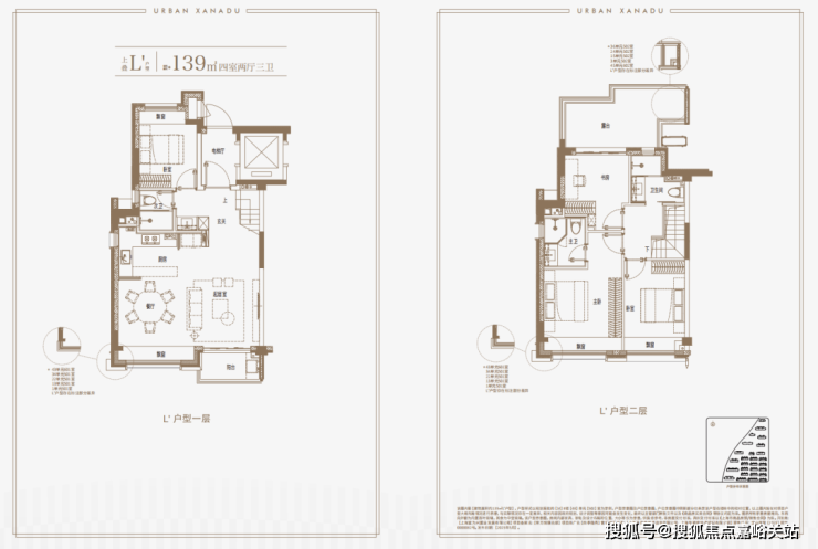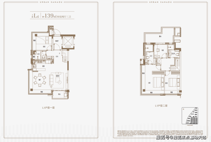 建面约139㎡上叠户型,三层是会客区,四层是居住区,阳台+露台+多个飘窗设计,附加空间非常大,在别墅类产品中实属罕见!