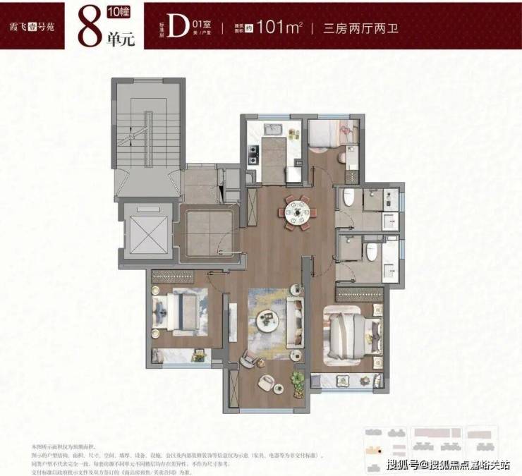 建面约101㎡3房D户型 ,三开间朝南,主卧套房设计,阳台与客厅一体化无阻隔同装修,空间观感更通透,采光更优越,也延展了家庭活动空间。