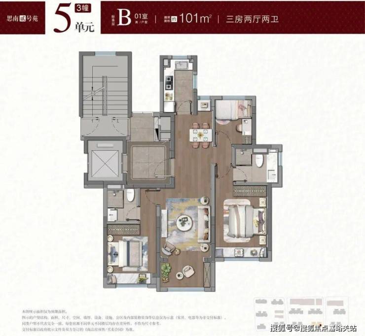 建面约101㎡3房B户型 ,准一梯一户享独立电梯厅 ,室内南北通透,三开间朝南,南向双卧套房是这个户型最大亮点。