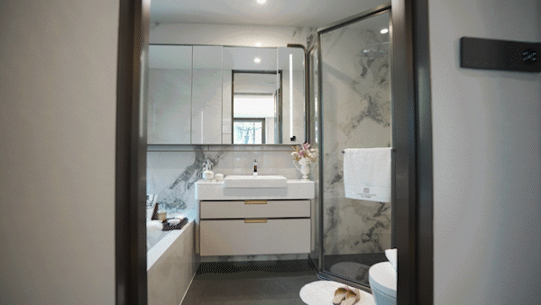 项目整个餐客厅均为岩板交付,岩板的尺寸达到了2.4米*1.2米,这是市面上非常罕见的大板配置,即便是市区豪宅,用的大尺寸也不过是1.8米!
