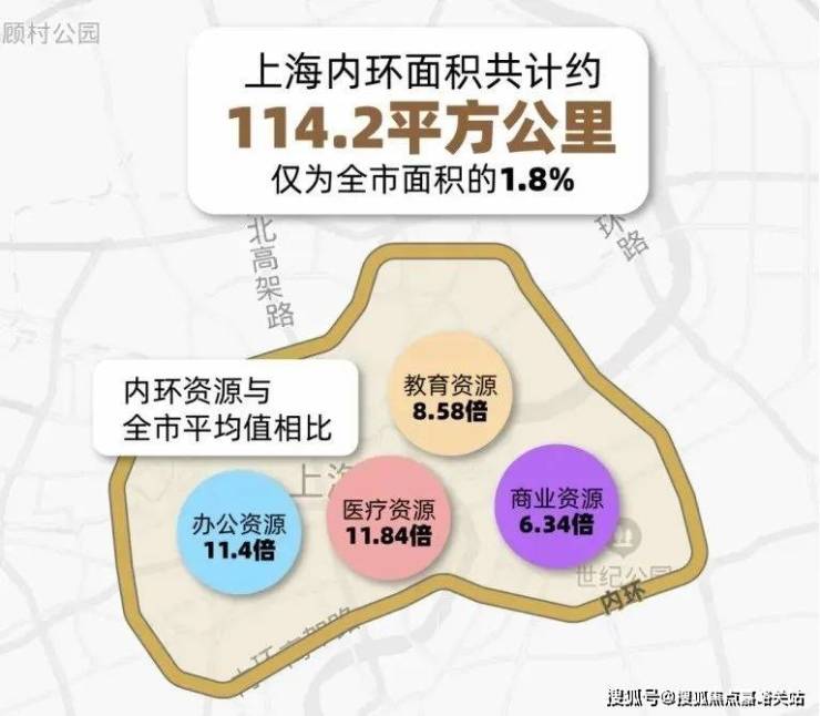 都知道上海买房看环线,而 内环向来都是上海少数人才能置业的地位象征,这里仅占全市总面积的约 1.8%,却集中了全市最优质的商业、办公、金融、教育、医疗等资源,拥有的城市资源 约10倍于全市平均,是上海没有争议的“硬核区”!