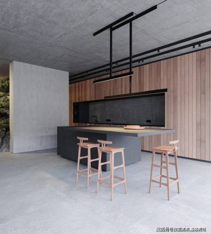 The kitchen and living room adopt an open layout, making good use of the small space. The cement wall embodies a strong industrial style and is unique.