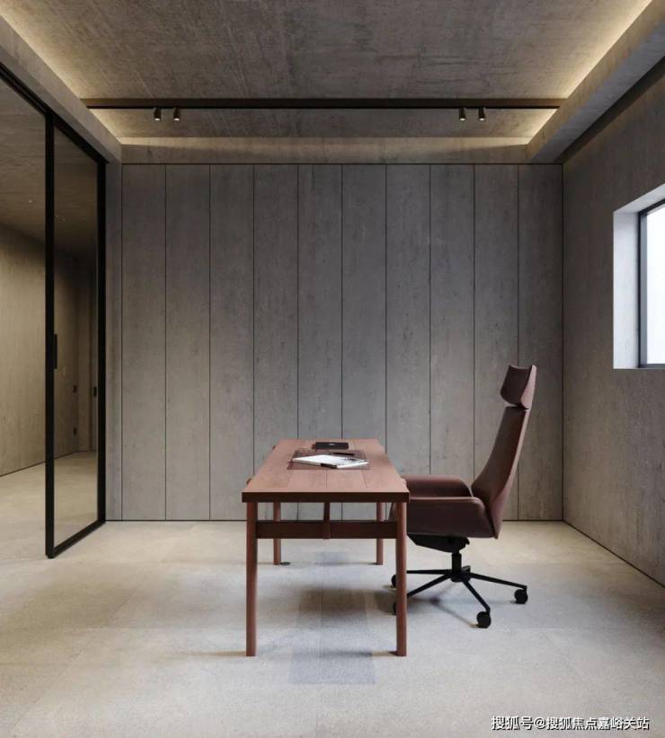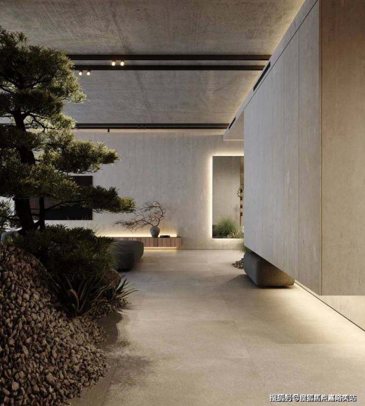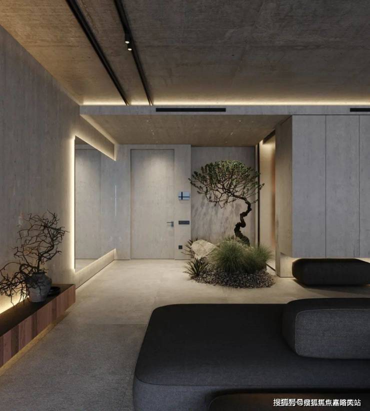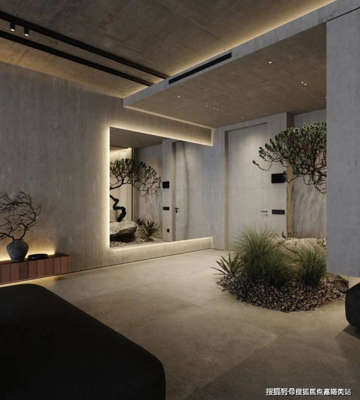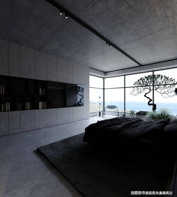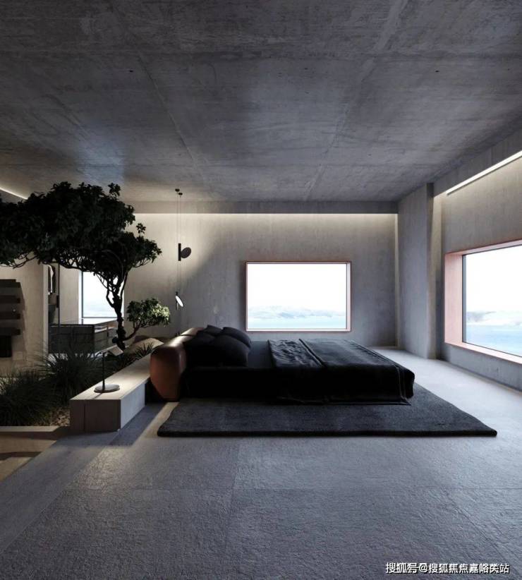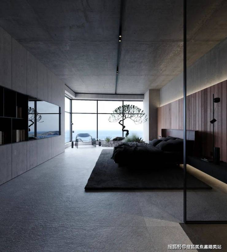 The bedroom still continues the minimalist design style. The stone background wall is used to echo the living room, and the steps are used to distinguish the space. The light gray ground creates a clean and pure space atmosphere.