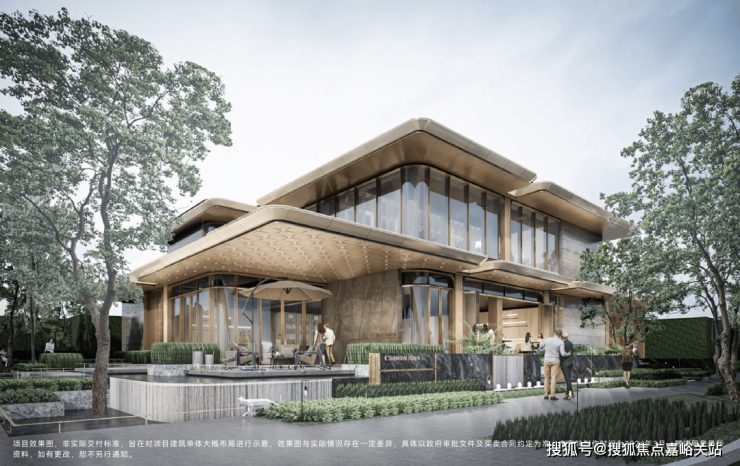 第一重——酒店式环道落客、现代精奢大堂、悬廊叠瀑水岸会客厅,移步异景,漫游归家入户;