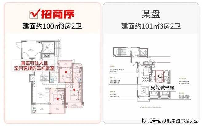 这是百平米3房那么多年一直无法解决的通病,但招商序的百平米3房却截然不同, TA凭借着3阳台的设计,给到客户一个真正的三房户型: