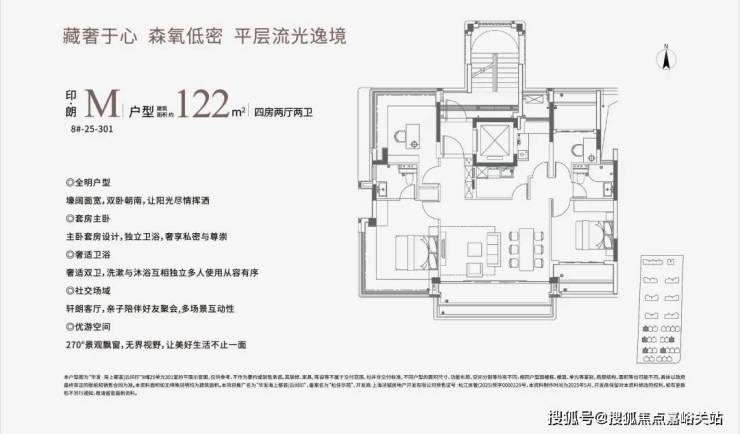 建面约122㎡的中叠四房大平层式设计,宽尺横厅+阳台+270°主套飘窗采光条件极佳,每天早晨都被阳光晒醒。