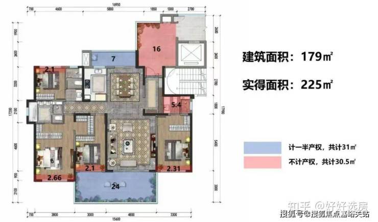 实得面积约121㎡,公摊约15.3%,单套房变为了双套房设计,即三个卫生间,对比目前的新房住宅,还是能打平的!