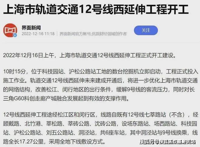 目前12号线西延伸正在加速推进,预计2027年底开通试运营。12号线西延伸在松江境内从G60云廊沿沈砖公路,东西向穿过洞泾,设沪松公路和刘五公路设站,在洞泾站与9号线交汇。