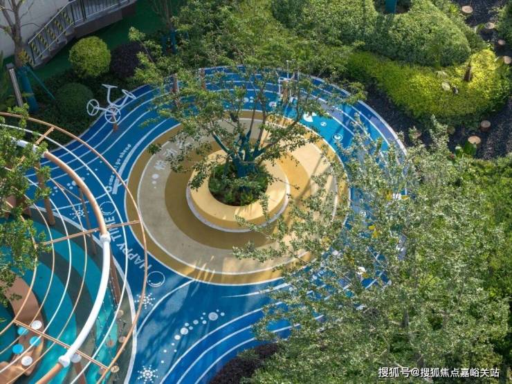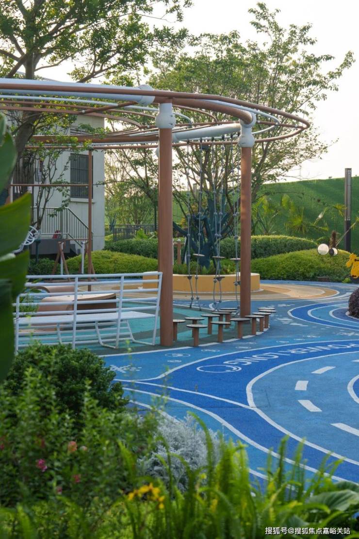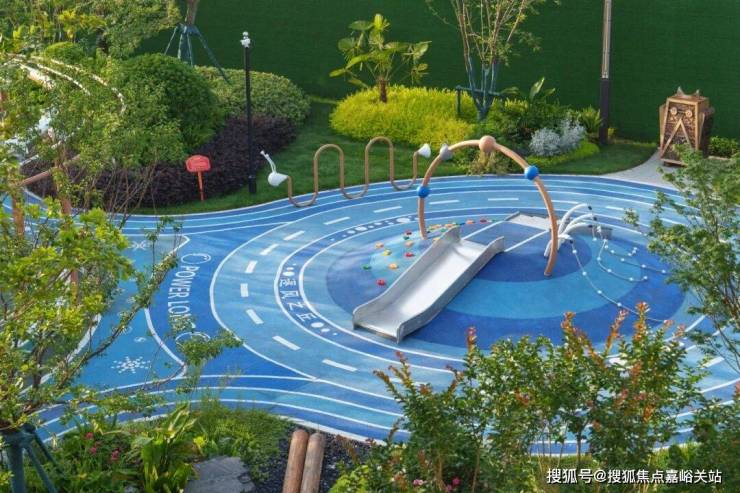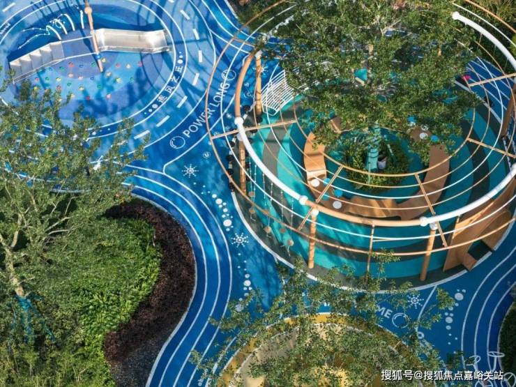 全场地被香樟、灌木等绿植环抱,树冠提供天然遮荫,蕨类地被植物软化边界。蓝色“海面”上漂浮着“悦动Life”“VIP”等文字岛屿,更设白鹿雕塑、秋千等趣味元素,让各年龄段儿童在安全挑战中感知海洋主题的活力与浪漫。