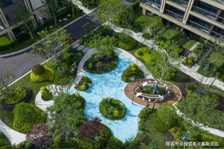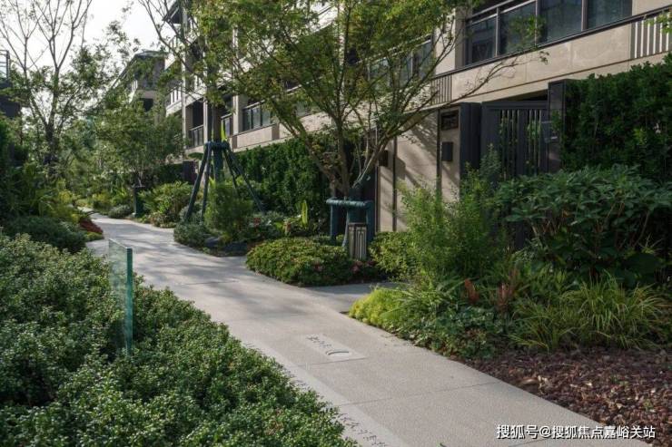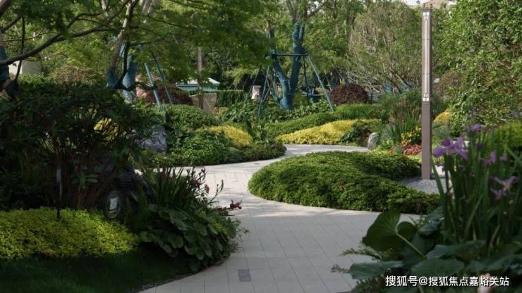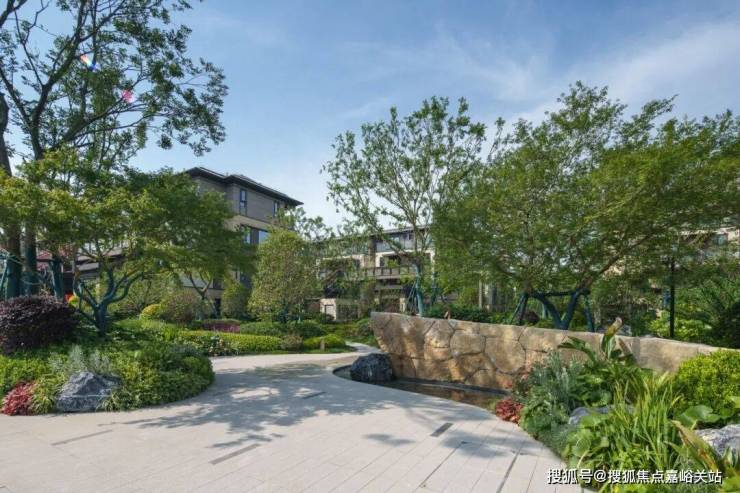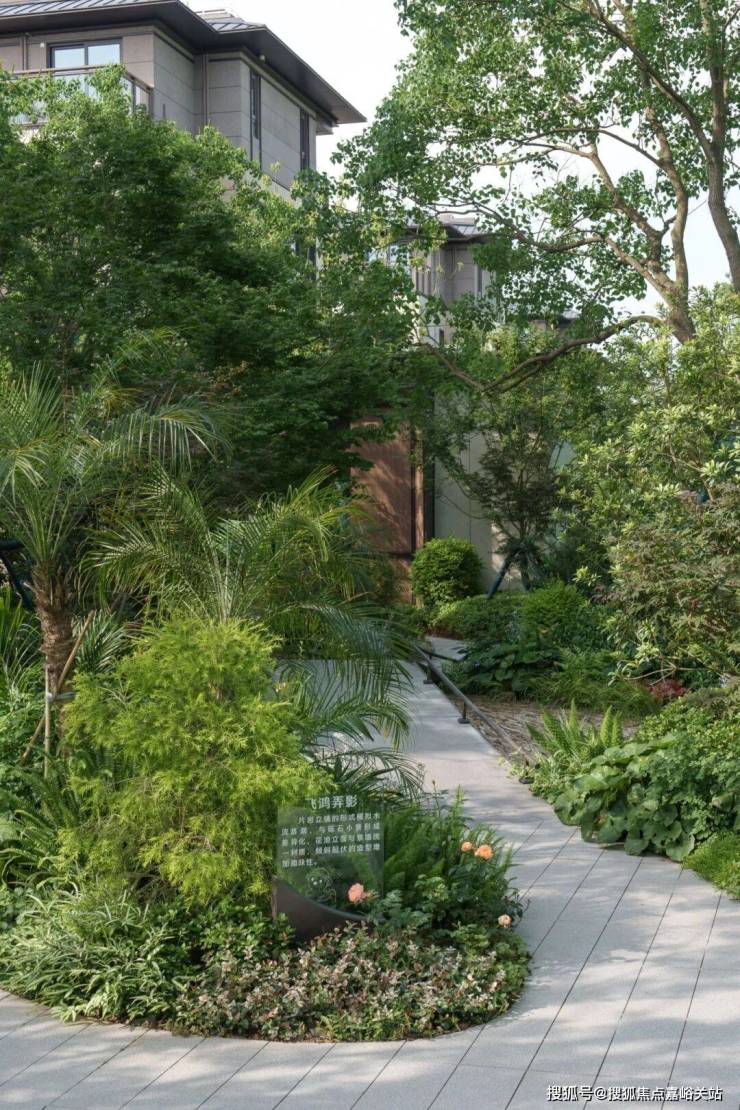 日间,阳光透过高低错落的绿植层次,在毛石墙面与水面上洒下斑驳光影;步道两侧的灌木、花卉与高大乔木形成丰富的景观层次,紫色鸢尾与其他花卉点缀其间,呈现"树比墅高,自然保持"的生态理念。