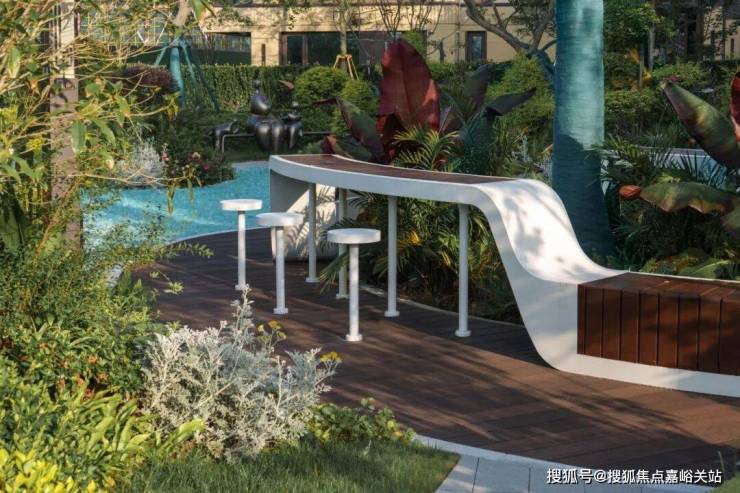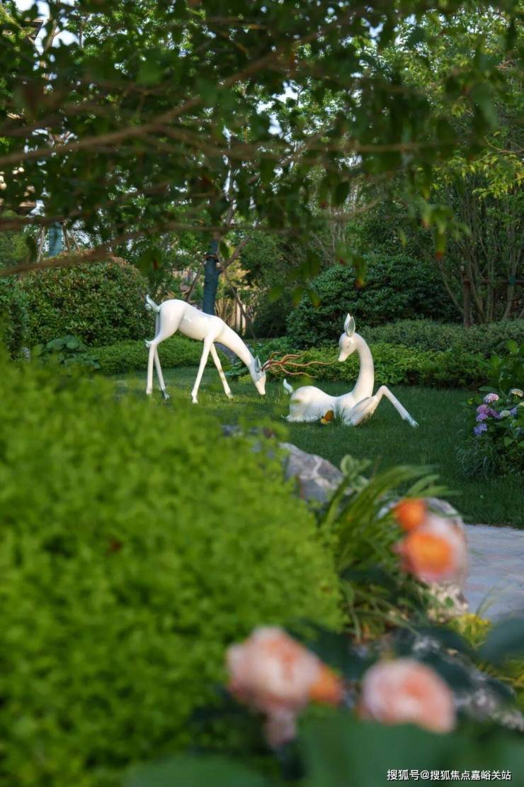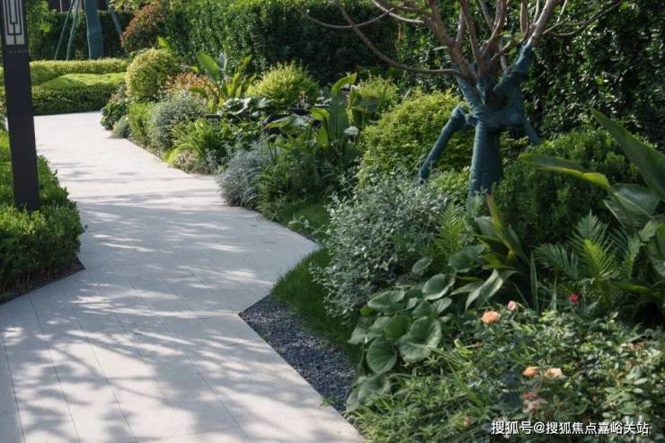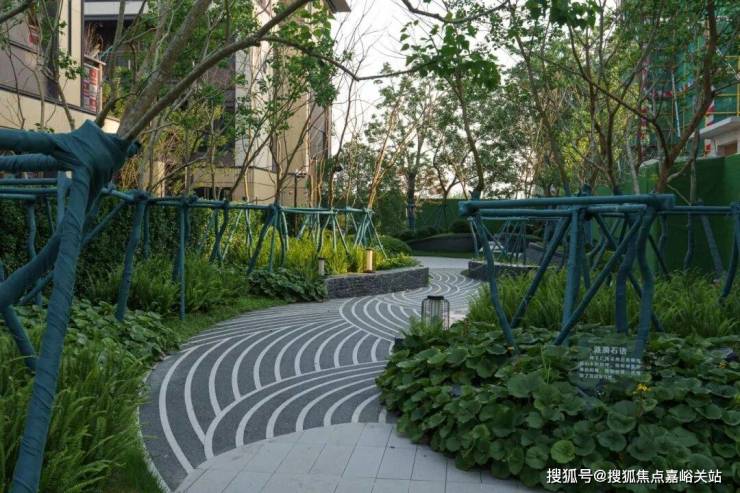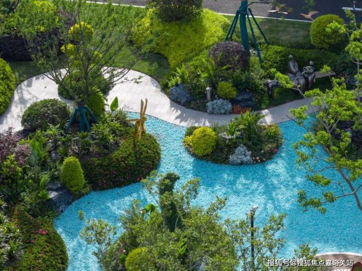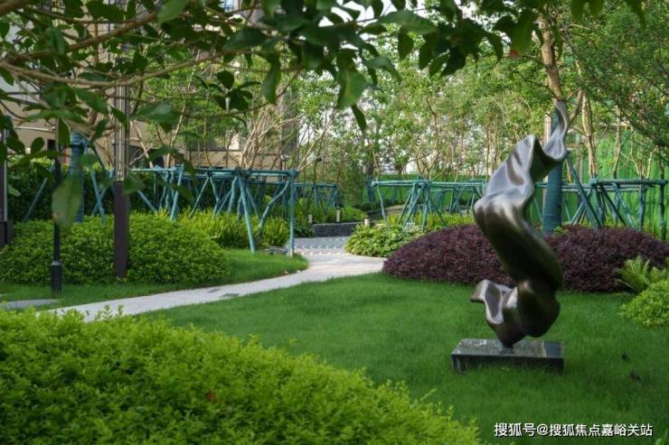 环绕雕塑的留白草坪犹如天然绿毯,蜿蜒的浅色小径如丝带般穿过草坪,连接各个功能区域。近处龟甲冬青、火焰南天竹等彩叶植物形成缤纷色带,与雕塑的金属光泽构成巧妙对话。这片开放空间既如自然绘就的立体画卷,更似社区中心的活力客厅,在艺术与自然的交融中,孕育着无限的生活可能。