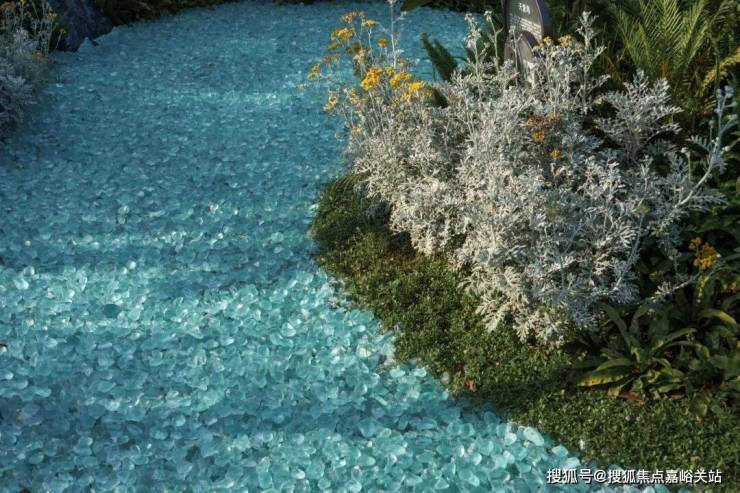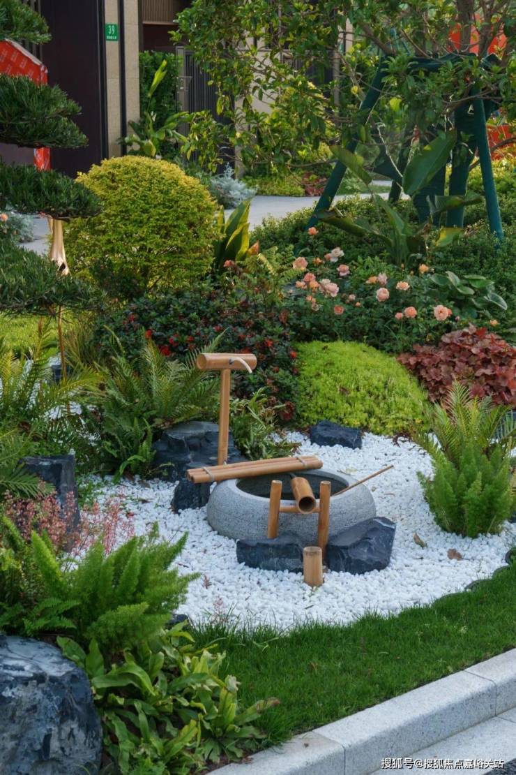 园路一侧,密林掩映间,匠心独具的条石旱溪蜿蜒如带。条石采用立铺工艺,肌理分明,在光影变幻间泛起粼粼波光。踏"溪"而行,脚下条石错落有致,既有行走的趣味,又具视觉的美感。旱溪两侧植被层次丰富:翠绿的龟甲冬青球与紫红的火焰南天竹相映成趣,金叶石菖蒲点缀其间,白色雏菊星星点点洒落绿丛之中,呈现四时不同的色彩变幻。