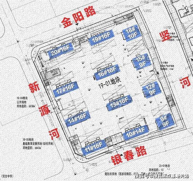 19-01地块规划:拟建7栋16F高层住宅、3栋9F高层住宅、1栋14F高层住宅、1栋10F高层住宅以及若干配套用房, 规划住宅套数下限622套。