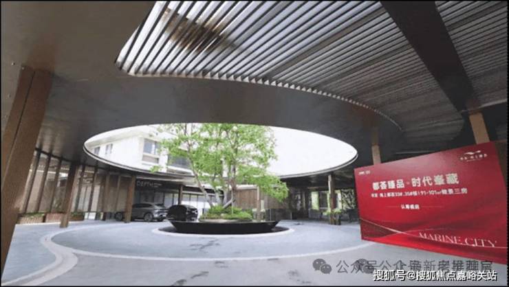 华发·海上都荟的 主入口做了环岛式酒店大堂设计,风雨回廊在天气炎热或者下雨天时让人更舒适,融合了酒店的精致感、艺术感,给人仪式感的入户体验。