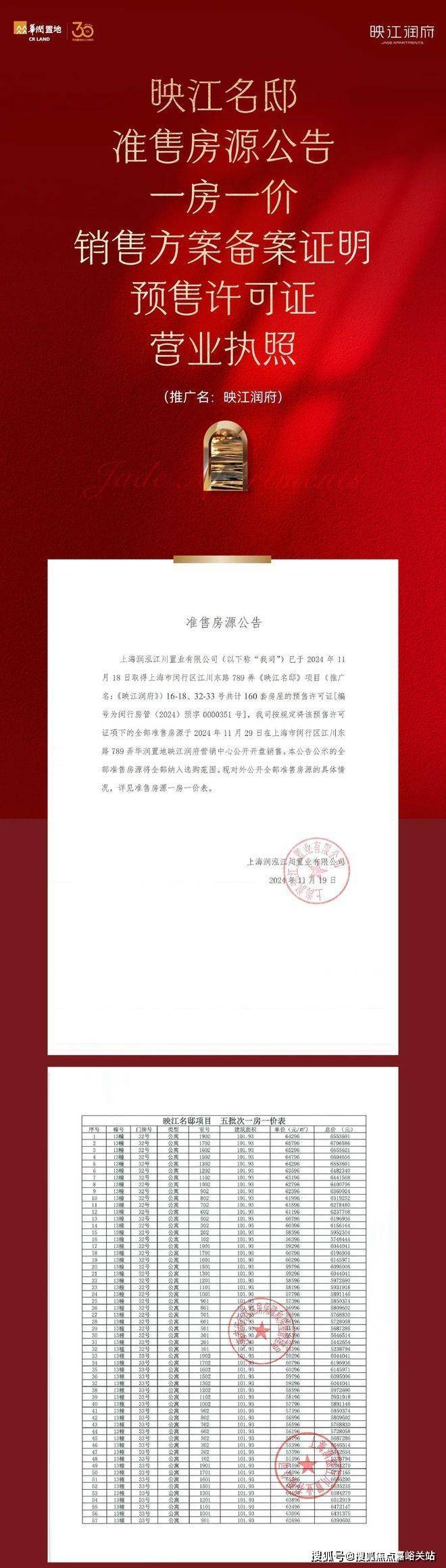本资料为要约邀请,不作为要约或承诺,项目具体信息以政府最终审批文件为准;项目周围环境、交通及其他公共设施的效果示意以实际落成或政府部门标准文件为准。有关学区划分根据政府部门当年的划分为准,不作为开发商的任何承诺。相关宣传内容不排除因政府规划、规定及分期规划、未能控制等原因发生变化,在不违反法律法规、合同约定前提下,本公司有权对该宣传资料细节进行调整或更新。预售证号:闵行房管(2024)预字0000120号、闵行房管(2024)预字0000164号、闵行房管(2024)预字0000232号、闵行房管(2024)预字0000269号、闵行房管(2024)预字0000351号。制作日期: 2024年11月19日。开发商:上海润泓江川置业有限公司;备案名: 映江名邸 ;营销推广名:映江润府