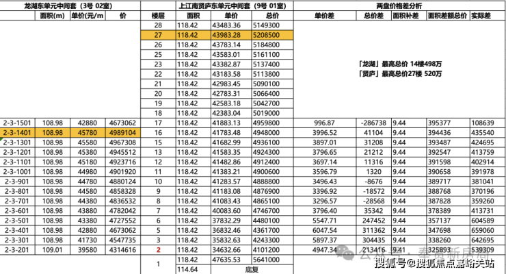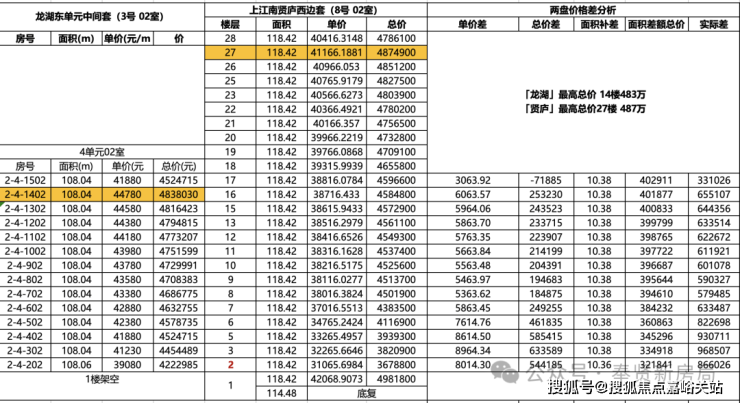 我们先来看看中间户型的价格分析:「龙湖」最高总价 14楼479万,「贤庐」最高总价27楼 463万。