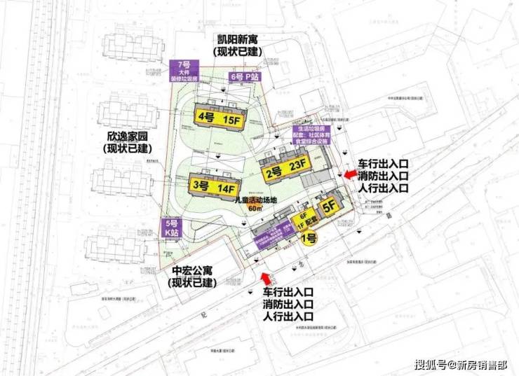 2号楼23层高层,3号楼14层,4号楼15层,2号楼的东北角是生活垃圾房,社区体育配套,食堂综合设施;