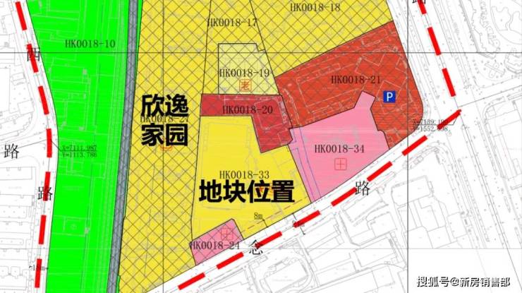 HK0018-33地块位于纪念路北侧,靠近逸仙高架路;地块形状不算规整,东侧紧邻HK0018-34地块,规划为社区医疗卫生用地;西侧是保留的现有住宅,欣逸家园。