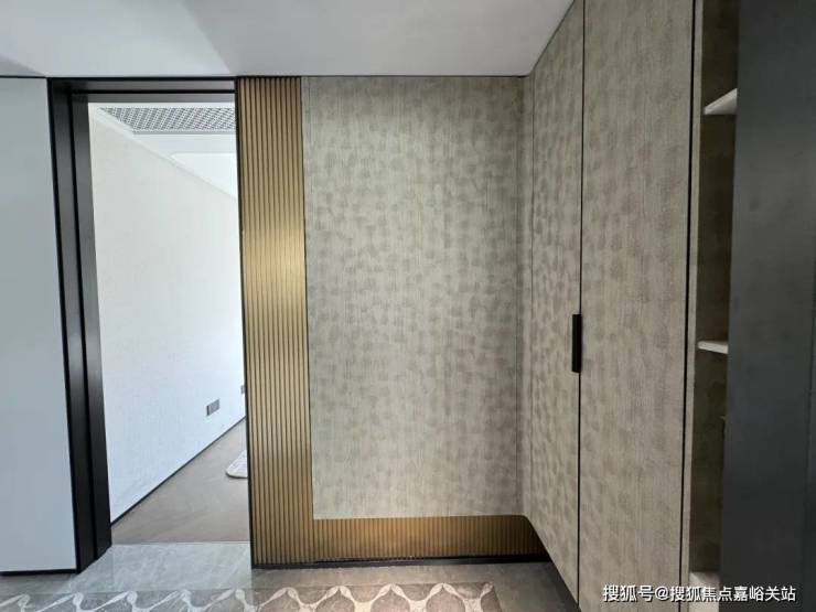 入户门是是非常有质感的铸铝门,带电子猫眼智能门锁;进门后是一个独立玄关,木纹玄关背景墙,右侧是通顶的悬浮玄关柜,内置鞋柜精灵和抽拉鞋架。