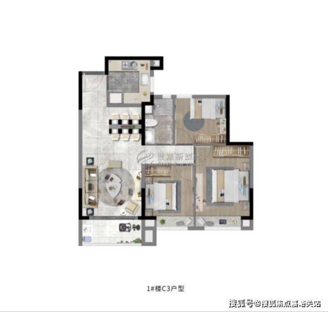 大名城映雨江南售楼处电话:400-856-9058☑️☑️建面约108㎡3房2厅2卫,做到了三开间 朝南+双阳台设计+主卧套房设计+南北通透,该户型得房率非常高。