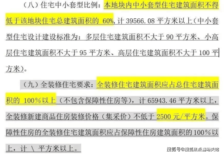 根据土地转让合同要求显示,项目规划 住宅套数下限656套,全部装修交付,装标2500元/m²(集采价)