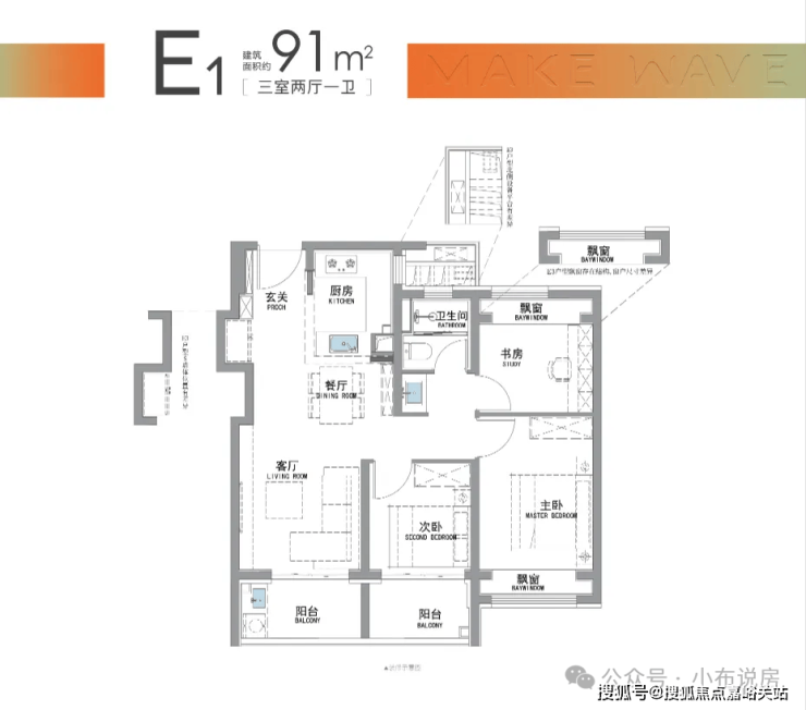 “南向双阳台+南北双飘窗”,构筑真3房户型!