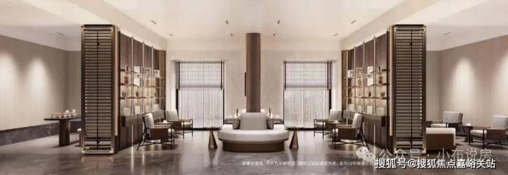 顶部香槟金造型 的异型 铝板 精致 典雅 ,搭配手工打磨的璀璨星空顶,仿若将银河纳入社区;地面仿石砖沉稳大气,与墙面汲取华尔道夫酒店精髓的浅米系大理石贴面相得益彰,营造出优雅静谧的氛围。