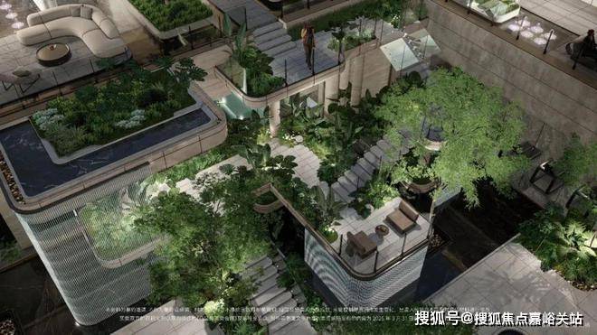 社区景观方面,项目运用室内手法室外化设计构想,将垂直景墙、悬浮观景台与叠水景观立体穿插,形成情随境转的沉浸式体验,自然元素渗透进室内,并与室内空间动态互动。