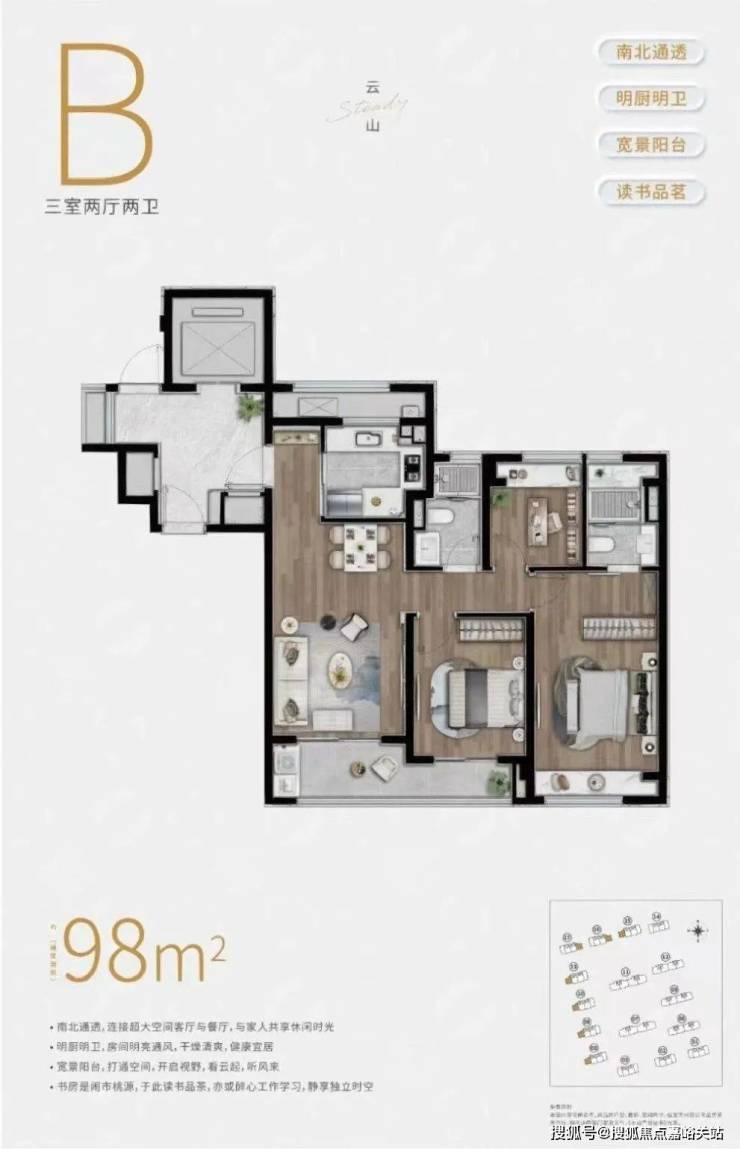 实用性方面,户型3房3卫、南向双套房的设计,可以保证每个家庭成员都能拥有更具私密性的居住空间。