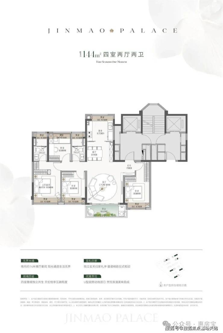 全屋五飘窗,且像主卧,飘窗满面宽,实用性很强,总面积超过7㎡,堪比常规三房户型的次卧了!建面约144㎡4房:类一梯一户设计,电梯厅私密入户;江湾金茂府售楼处电话:400-8894-986🍵🍵🍵