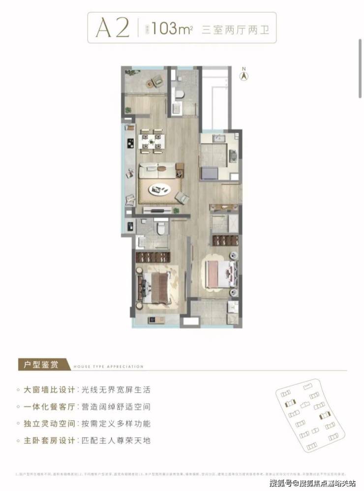 建面约103㎡3房2厅2卫,边套户型, 做到了三个面采光+双开间朝南+主卧套房设计+南北通透,室内通透明亮。