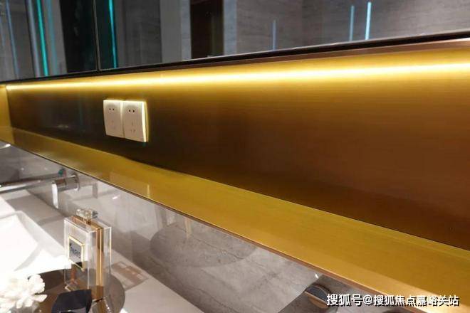 主卧的独立卫生间内,不仅有镜柜和壁龛,镜柜下方还做了一层金属收纳格(还附有插座),女主人随手取下的耳钉发卡、使用频率较高的护肤品,都能妥善放置,双人台盆下方还有大抽屉可收纳各类物品。