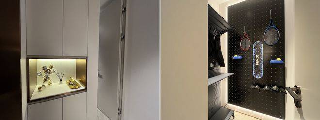 建面约205㎡户型进门处,在保留原有储藏室的基础上增设了玄关柜,钥匙、零钱包、门卡之类的小物可随手摆放;