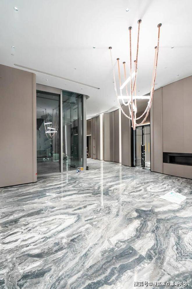 同时,大堂墙面全部采用定制弧面铝板,大理石拼花地面与整体大理石幕墙纵贯天地。光这个大堂,就足够惊艳。