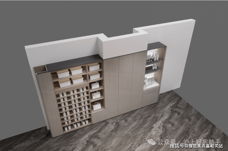 主卧和约99平户型一样,衣柜更大形成衣帽空间,还交付有半开放式、类似于酒店的迷你吧设计: