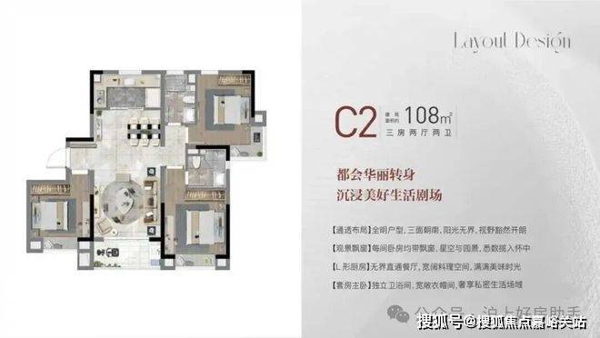 大名城映雨江南售楼处电话4008569058☑️☑️建面约108㎡3房2厅2卫,做到了三开间朝南+双阳台设计+主卧套房设计+南北通透,该户型得房率非常高。