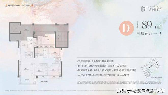 先来看看建面约89㎡三房两厅一卫(D户型),不仅功能完备,而且很好地把控了总价,约350万起即可上车高配品质三房,空间感十足!