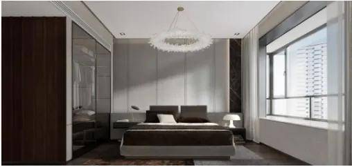 主卧的打造上是经典的“酒店式”套房设计,在保证私密空间不受打扰的同时,还拥有清晰流畅的动线快速抵达其他功能区。