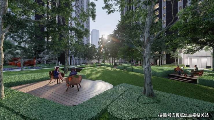 在活动大草坪上互动,其中 有专属儿童乐园,景观中还保留了一些休闲平台和户外凉亭可供家长看护孩子,打造住宅花园城市中的平静绿洲,塑造与大自然的互动体验。