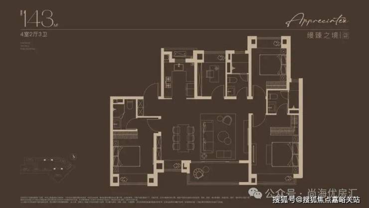 建面约143㎡四房设计,不论是三代同堂还是二娃家庭,都舒居无忧!2梯2户的设计, 极具私密性的入户门厅,彰显大宅归家礼序 。独立玄关,既是归家仪式感,更添收纳空间;约14米朝南面宽,搭配约7米尺度横厅,尽显大宅风范; 东西双套房设计,奢享全龄世家的静谧时光。