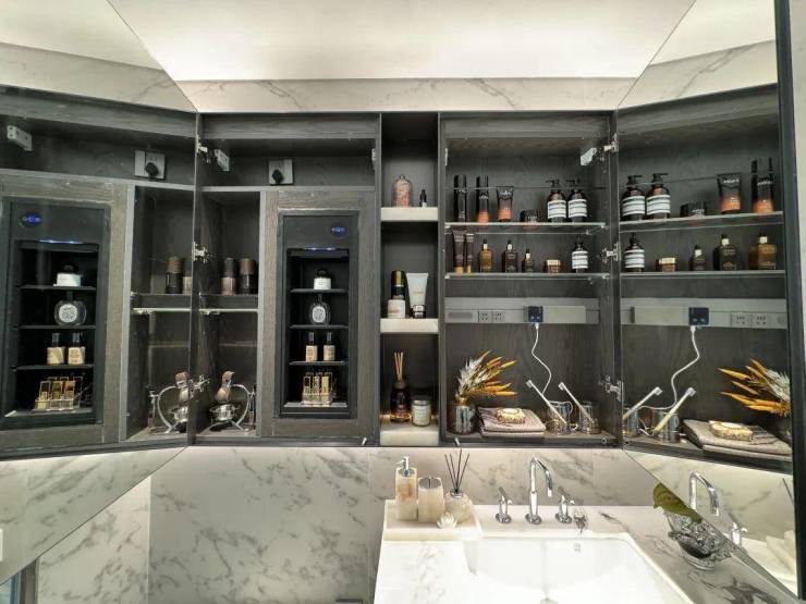双卫配置,其中一个做了干湿分离,科勒台盆+双智能马桶+高仪花洒,除雾镜柜均内置了牙刷消毒器、预留吹风机插座。主卫镜柜还有美妆冰箱,收纳空间相当充足。招商中旅观境售楼处电话☎:400-833-6309(预约热线)✔✔✔